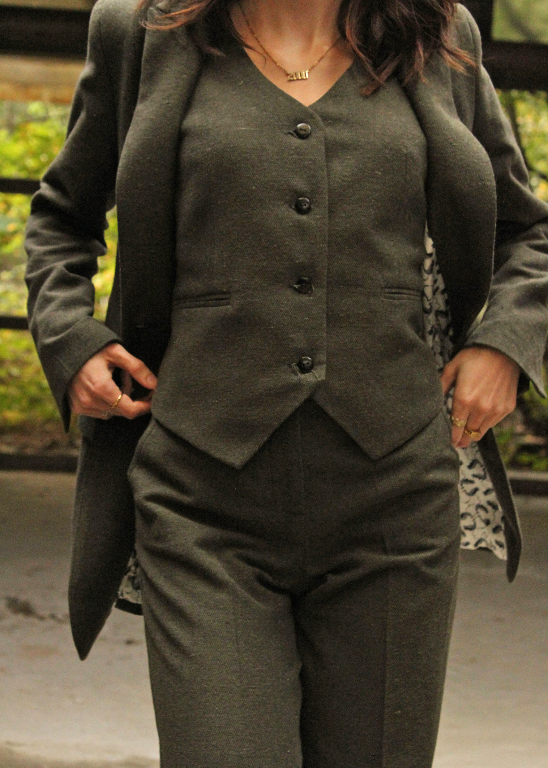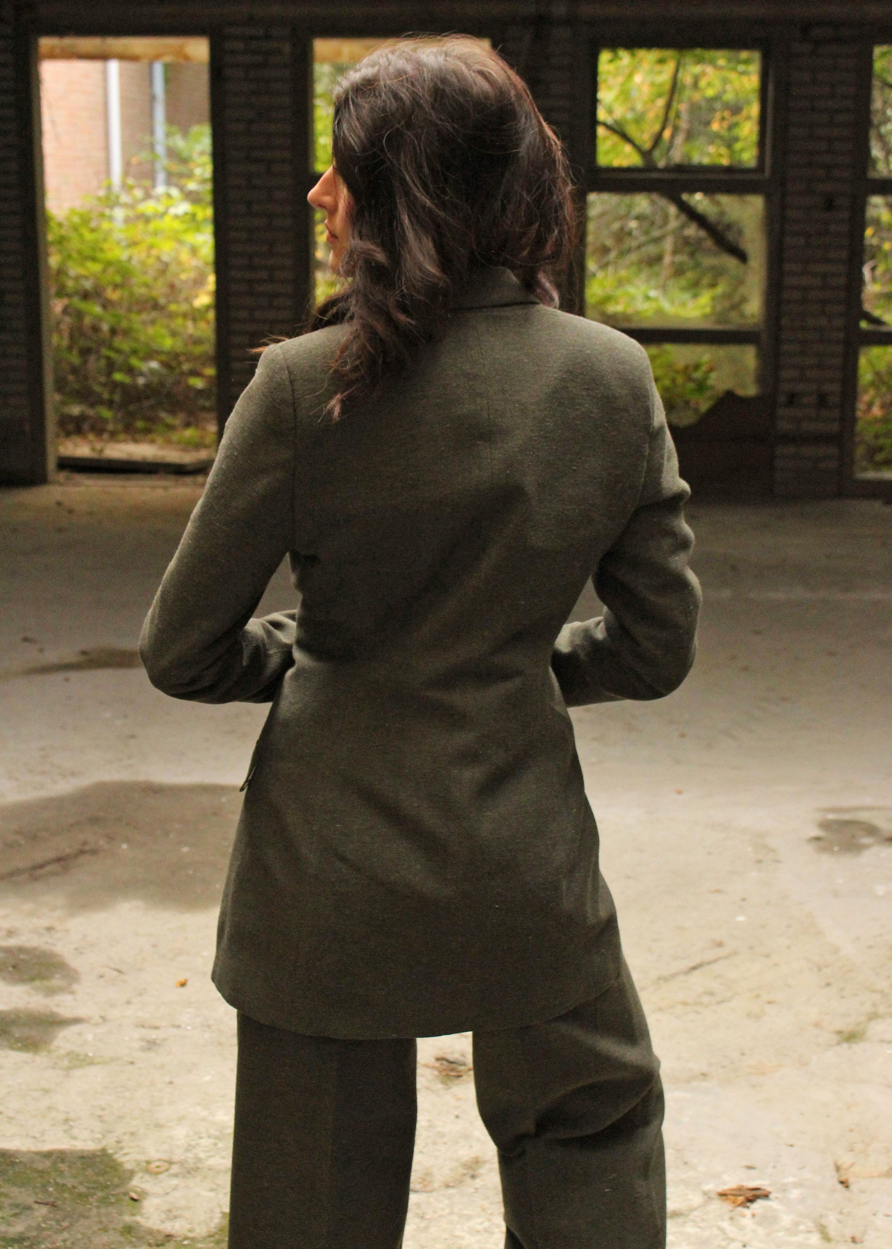 Op maat te bestellen in drie kleuren: army, jeans en zwart. Perfect te combineren met het gilet en de high waist trousers.