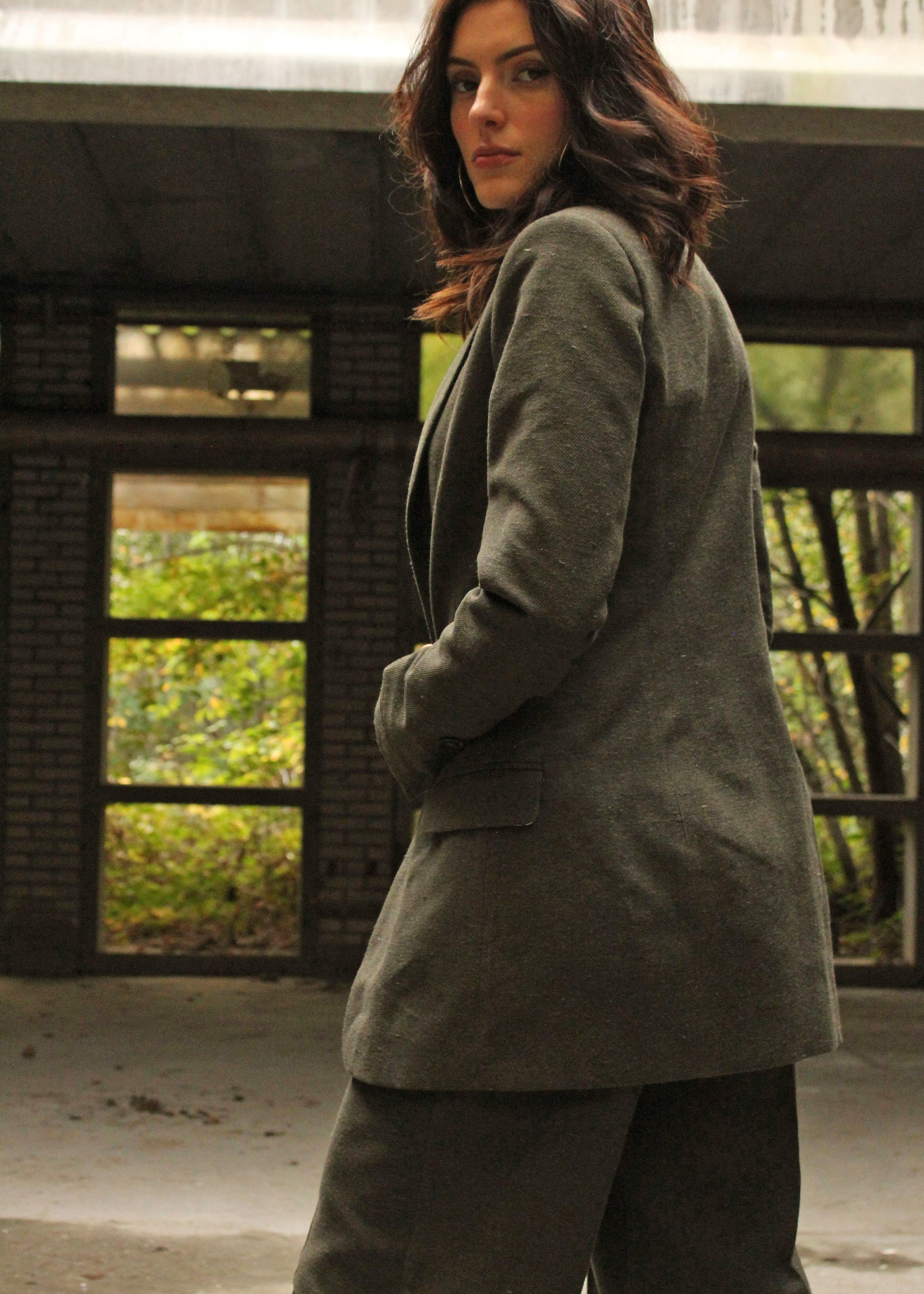 Deze getailleerde blazer op heuplengte combineert kracht en stijl. De stof is gemaakt van gerecycled materiaal van Wolkat, afkomstig uit ingezamelde kleding die volledig opnieuw is verwerkt. Het resultaat: een stoer maar stijlvol jasje dat duurzaamheid en design samenbrengt.