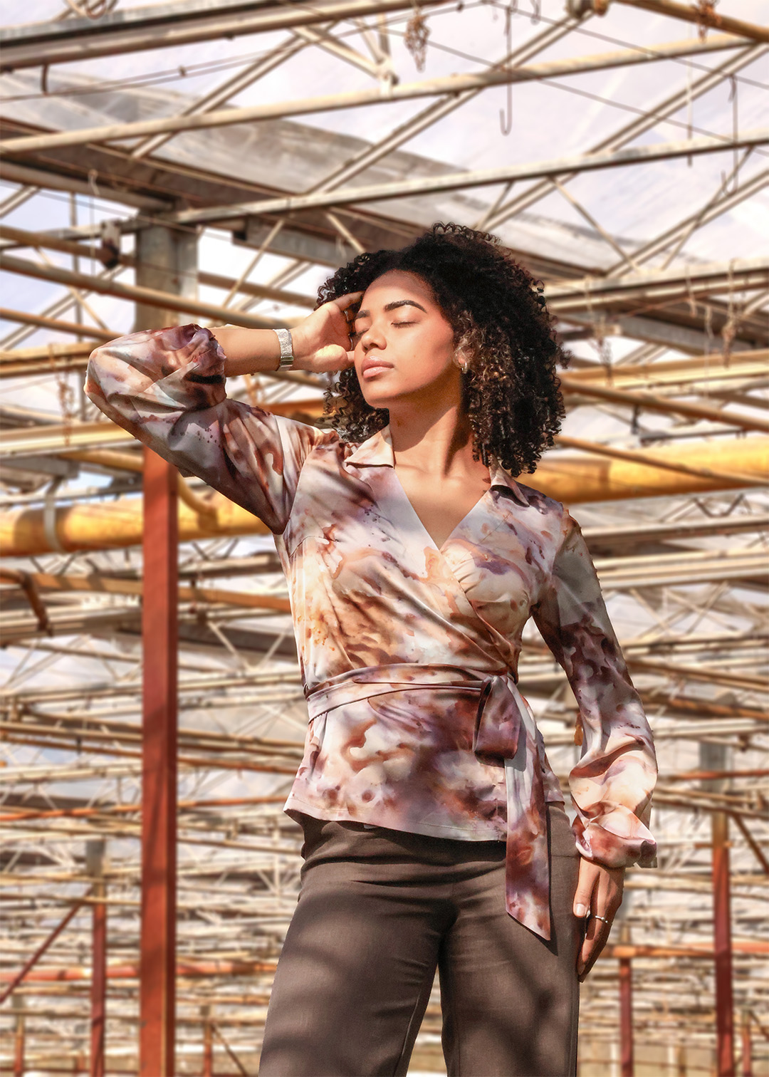 Deze overslagblouse combineert een elegant silhouet met een unieke, artistieke uitstraling. De vrouwelijke pasvorm met strikceintuur accentueert de taille, terwijl de soepele stof mooi langs het lichaam valt. Verkrijgbaar in drie bijzondere kunstdessins: twee prints zijn geïnspireerd op kunstwerken van Carola van Benthum en het felgekleurde dessin is ontworpen door gastkunstenares en vriendin Emelie Jegerings. Een echte eyecatcher die kunst en mode samenbrengt.