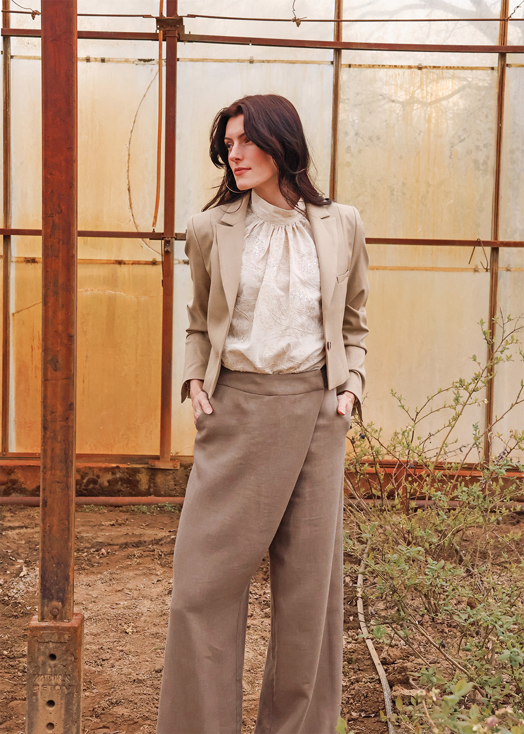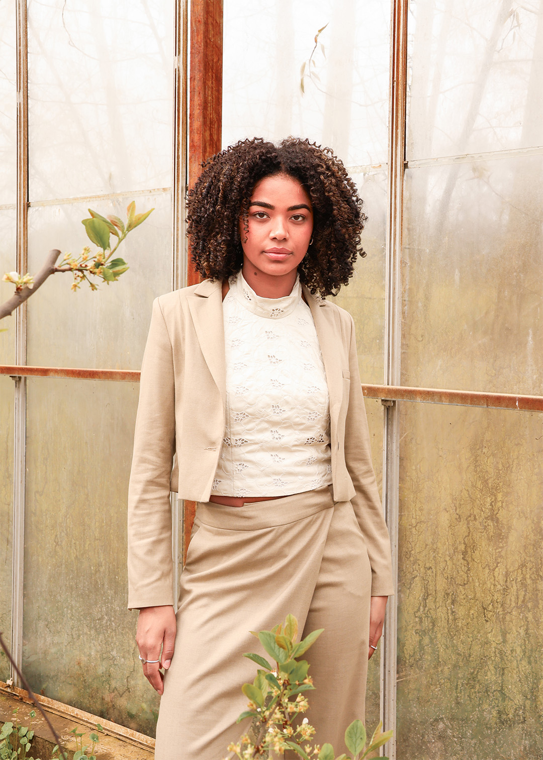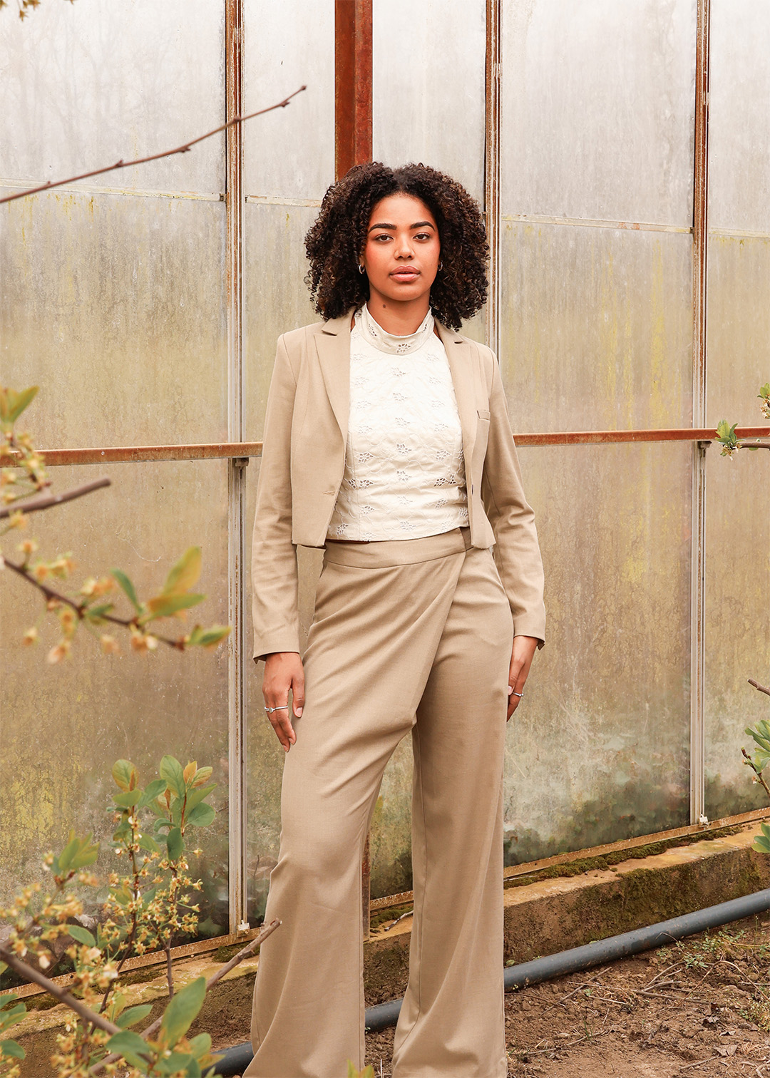 Dit korte jasje geeft elke outfit een elegante en krachtige uitstraling. De getailleerde pasvorm en cropped lengte accentueren het silhouet op een flatterende manier. De licht gestructureerde schouders zorgen voor een moderne, stijlvolle touch, terwijl de bijzondere voering met vogeltjes dessin een subtiel uniek detail toevoegt.